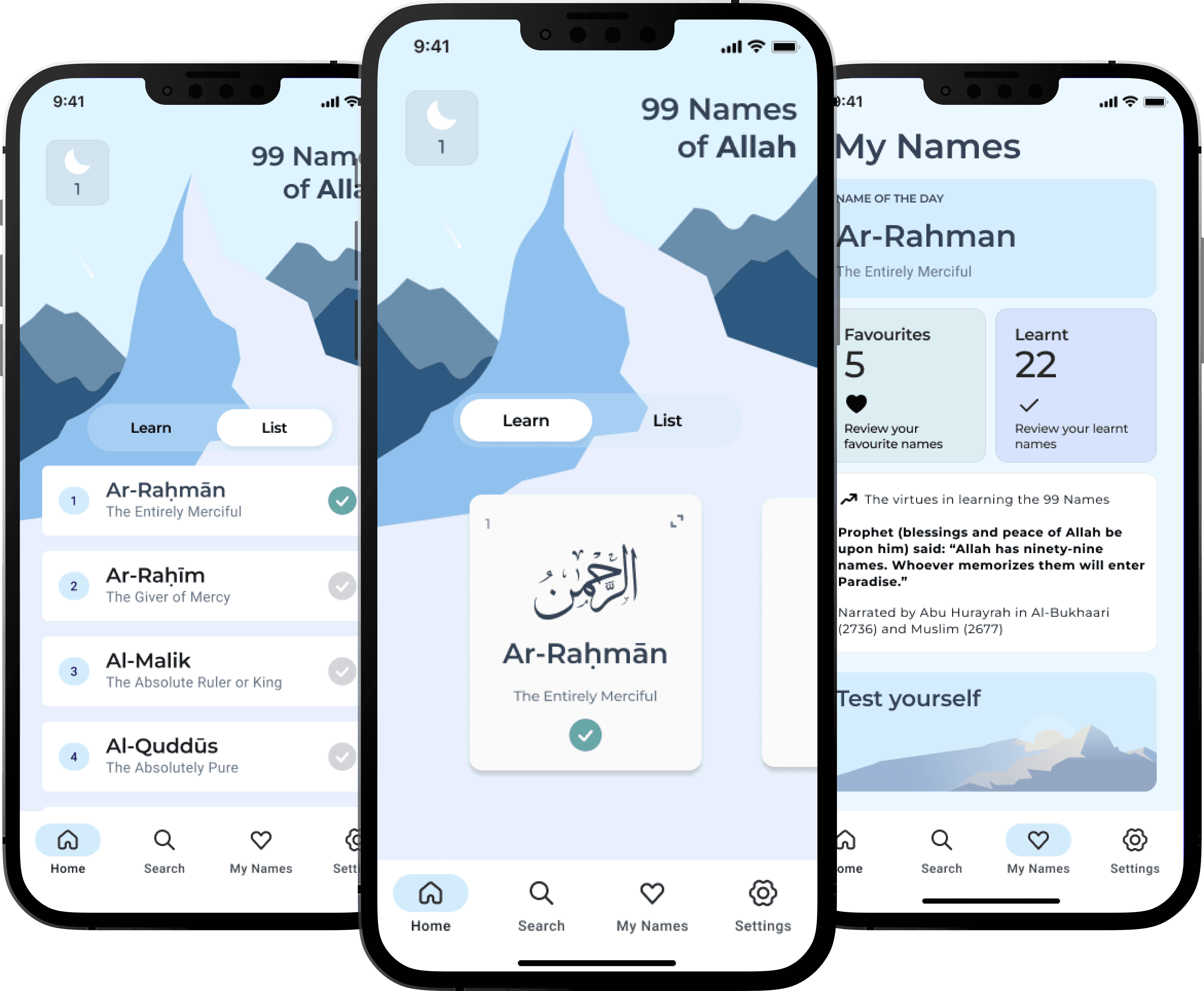 The Names app is dedicated to helping Muslims learn the 99 Names of Allah (Asma ul Husna). It is a platform created and developed exclusively by Muslims for Muslims.